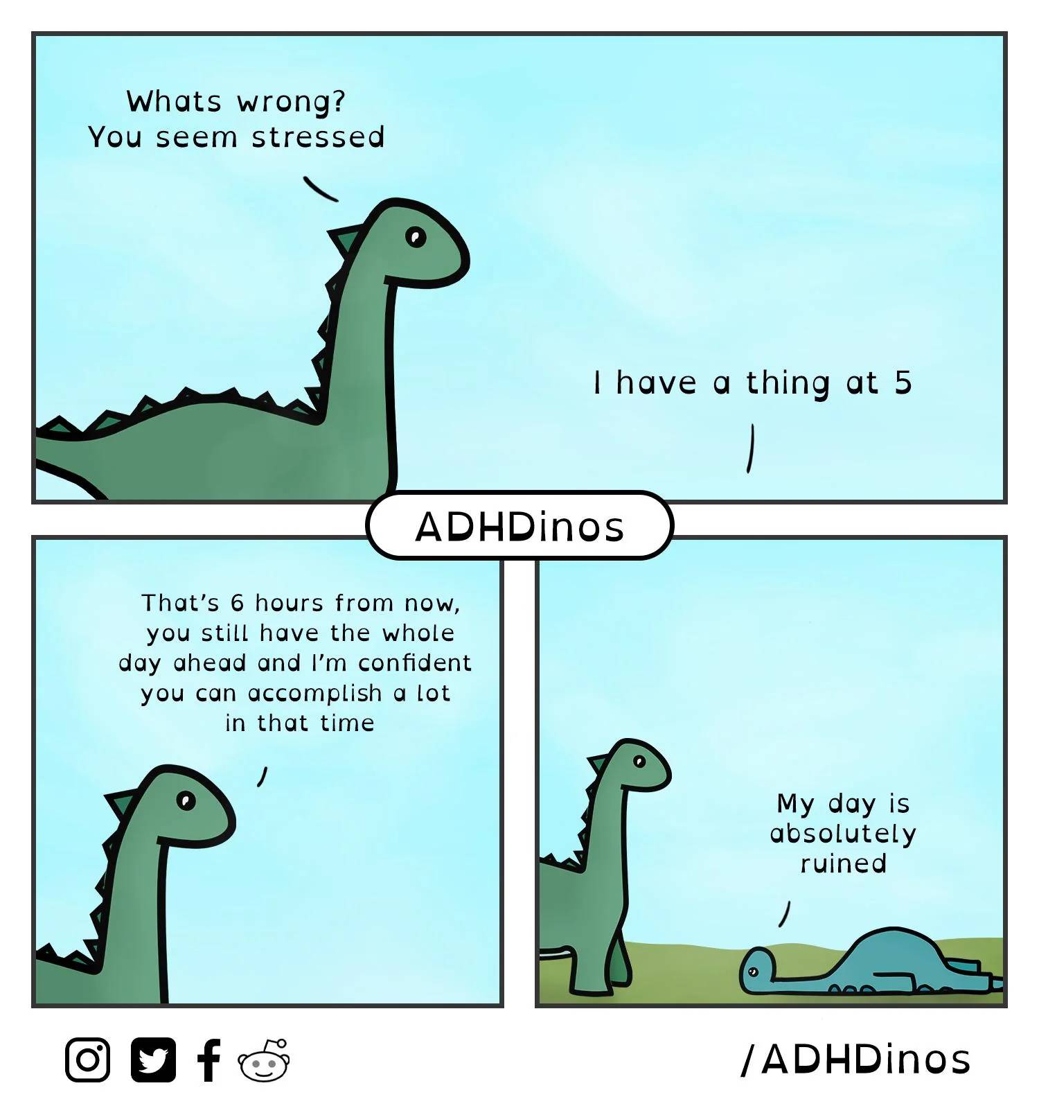 In this particular ADHDino (non-affiliate link) comic, we see our hero defeated by “a thing at 5”.
