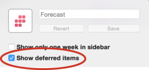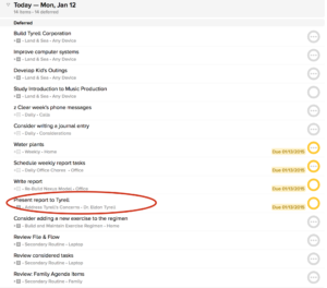 However, after some time, these sorts of tasks can easily bog down the system. Many repeating routine tasks obscure those that we would prefer to otherwise call our attention. For instance, an important task to contact your employer could be lost in an array of deferred tasks, as seen here in the Forecast perspective: