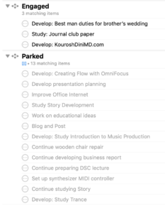 As successful as Mr. Buffett is, I’m not sure I’m willing to entirely buy in, as I think his process should be used with caution. My own methods clearly do have similarity: I use essentially choose 3 ongoing projects and set the rest aside for the time being. For example, here you can see tasks representing my ongoing projects resting up top. Tasks representing on hold projects sit below:
