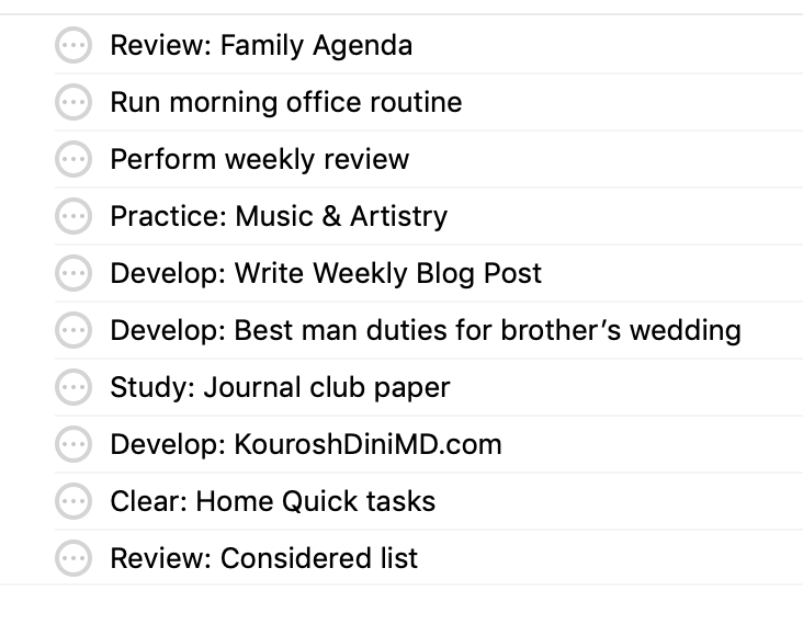 These then translate into a list of things to do today. This way, my major 3 projects integrate nicely with my routines: