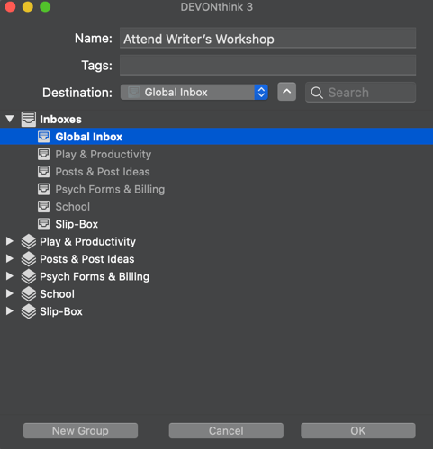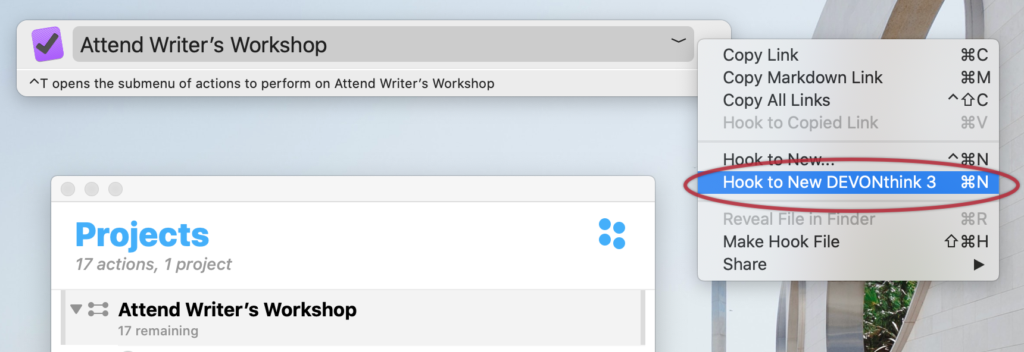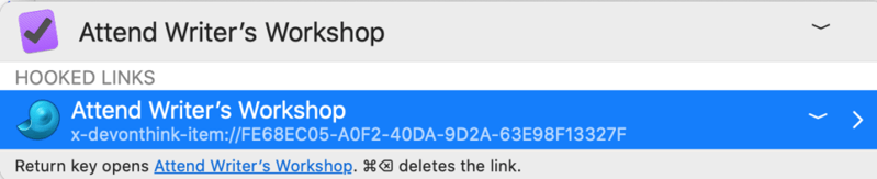 There's a neat connection you can create using Hook and DEVONthink. Hook is a program that creates a palette of connected items throughout your system. I've described using Hook before when using it with OmniFocus.