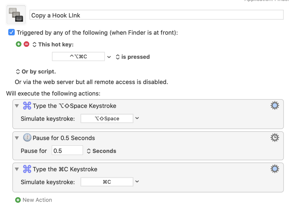 - Addendum 2020-08-04: Please note that the default for calling Hook is Shift-Command-Space, whereas I have changed my own to Shift-Option-Space. To make the Keyboard Maestro work for yourself, you would need to adjust the key command accordingly. ↩