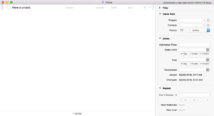 An Inbox is integral to any solid task system. Whether we decide to use a piece of paper for a single session of work or a task manager to orchestrate many sessions, we need some way to set thoughts aside while focused. There are several important properties of an Inbox are that it: