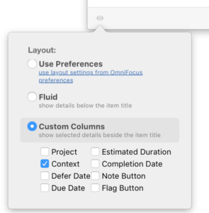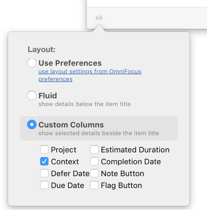 The Quick Entry guides me to only enter what is necessary for now. The Quick Entry is simply presented, prompting me only for the task's title and contact. The project, defer date, due date, flag, and note fields are conspicuously absent. If I truly need to add a flag, I can use my key combination (Shift-Command-L) or if I need to add a note, I can use (Command-’). This way, the task will not be automatically whisked off to projects that have a default context assigned. It is deliberately held in the Inbox for later processing as its own session. To set your own Quick Entry appearance: