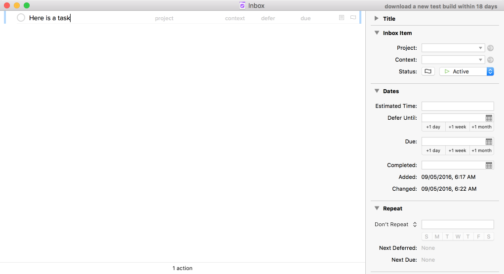 However, we can still use an Inbox problematically by assigning a task more characteristics than are necessary to simply setting a thought aside. For example, while I work on Project X, an idea comes to mind about checking on a file upload I had started earlier. I might then write, "Check on file upload", assign it to its own project "Build Flying Saucer" and also assign it a context "@Laptop". I then decide if that is enough information for me to see the task when and where it would useful to be seen. Perhaps I add a defer date, due date, or flag, too. While it may seem that I am saving future Inbox processing time, I am actually creating several avoidable problems such as: