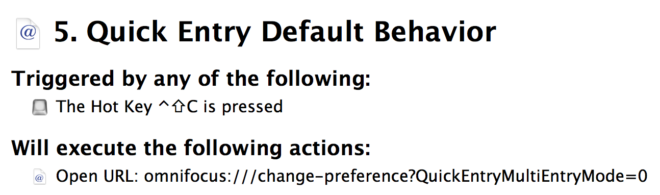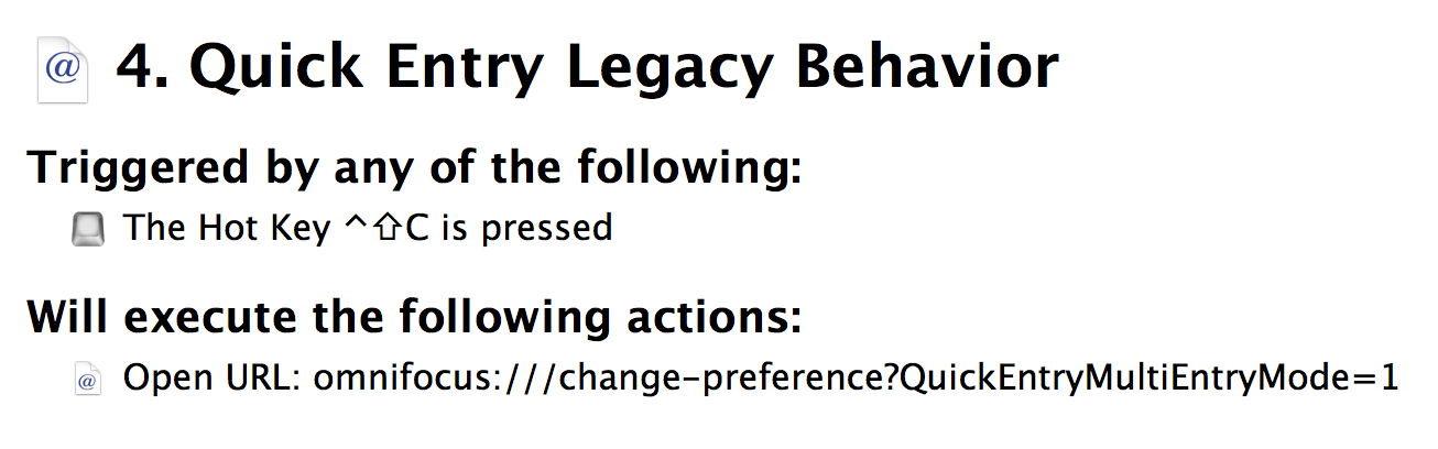 Secondly, I prefer to use the legacy behavior of the Inbox from OmniFocus 1. In OmniFocus 2, the Inbox disappears by typing Return. However, I often have several ideas at once, and I would like the Quick Entry Inbox to remain until I am done with it. If you would like to use legacy behavior, enter the following code into Safari[1]: